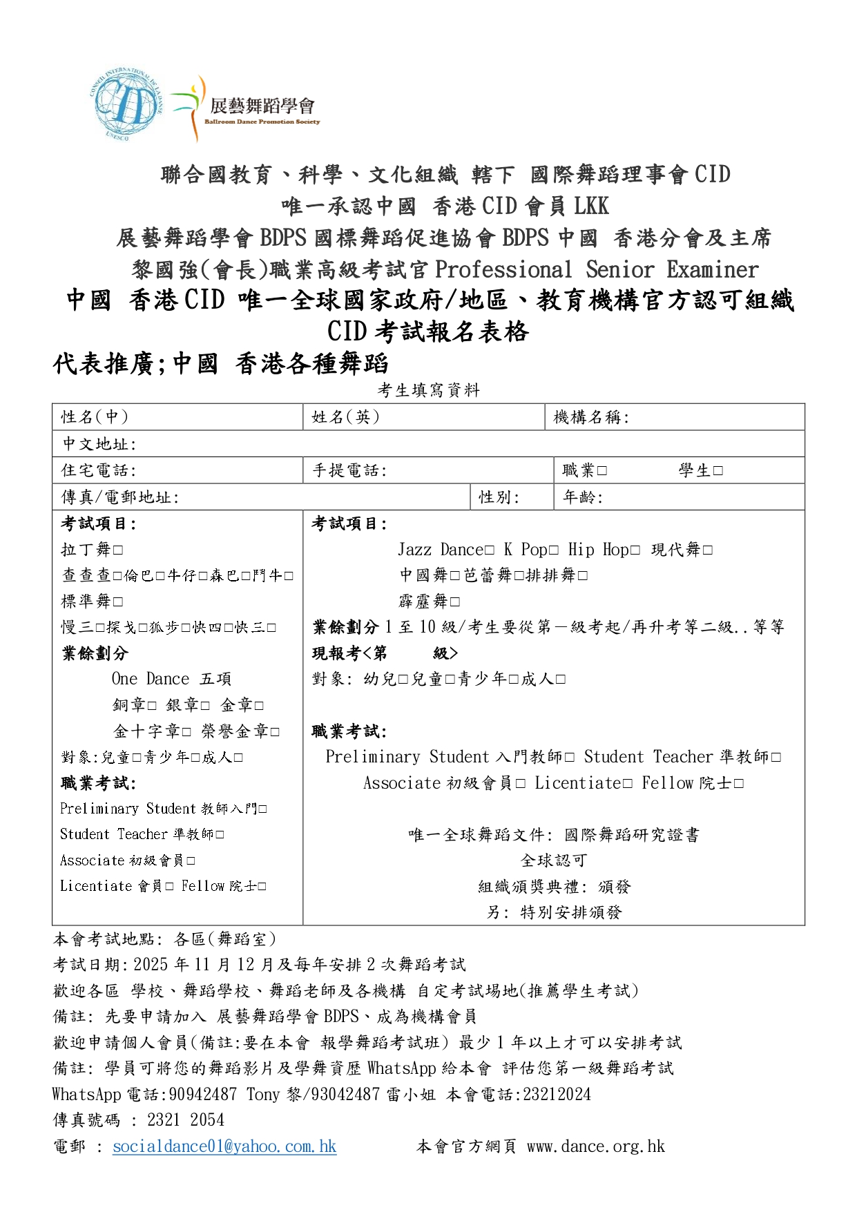 | 國際舞蹈理事會CID 2025-2026國際認證證書 業餘及職業考試 報名表格 |