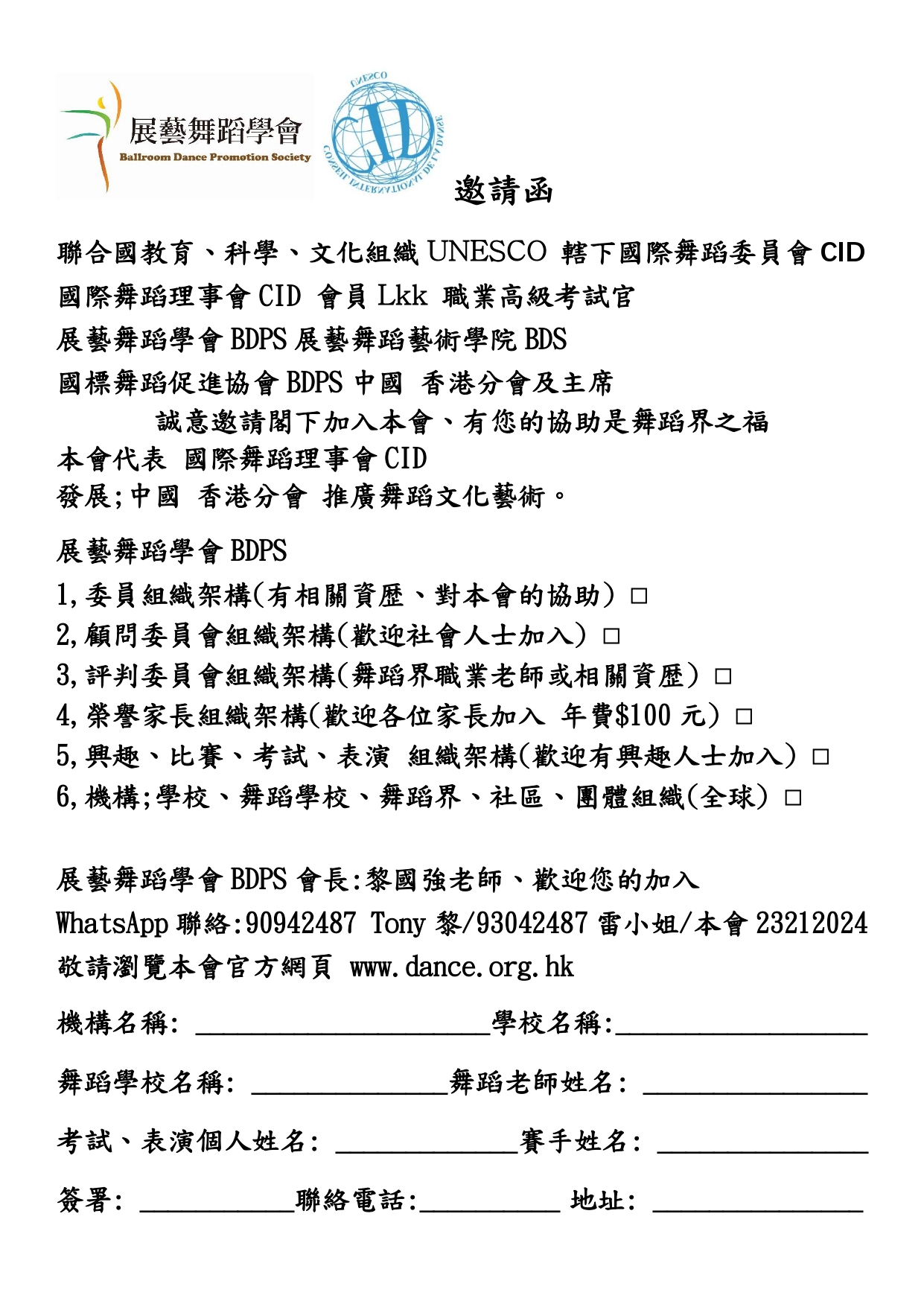 | 展藝舞蹈學會BDPS 2025-2026 機構、社會人仕、家長申請入會表格 |