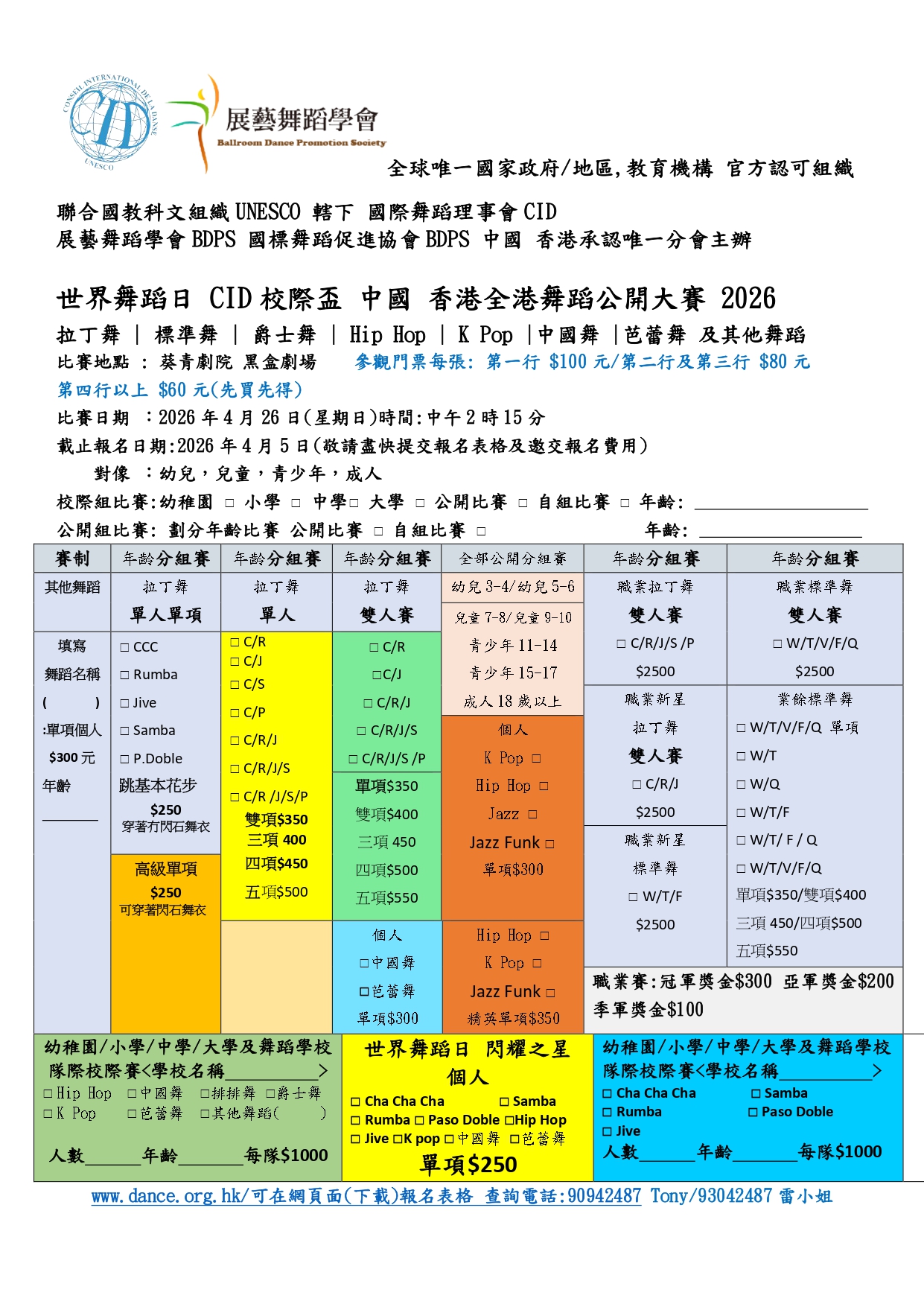 | 世界舞蹈日 CID 盃 2026年4目26月日 中國 香港 校際盃 全港舞蹈公開大賽 䀈 舞蹈匯演 報名表格 頁面 |