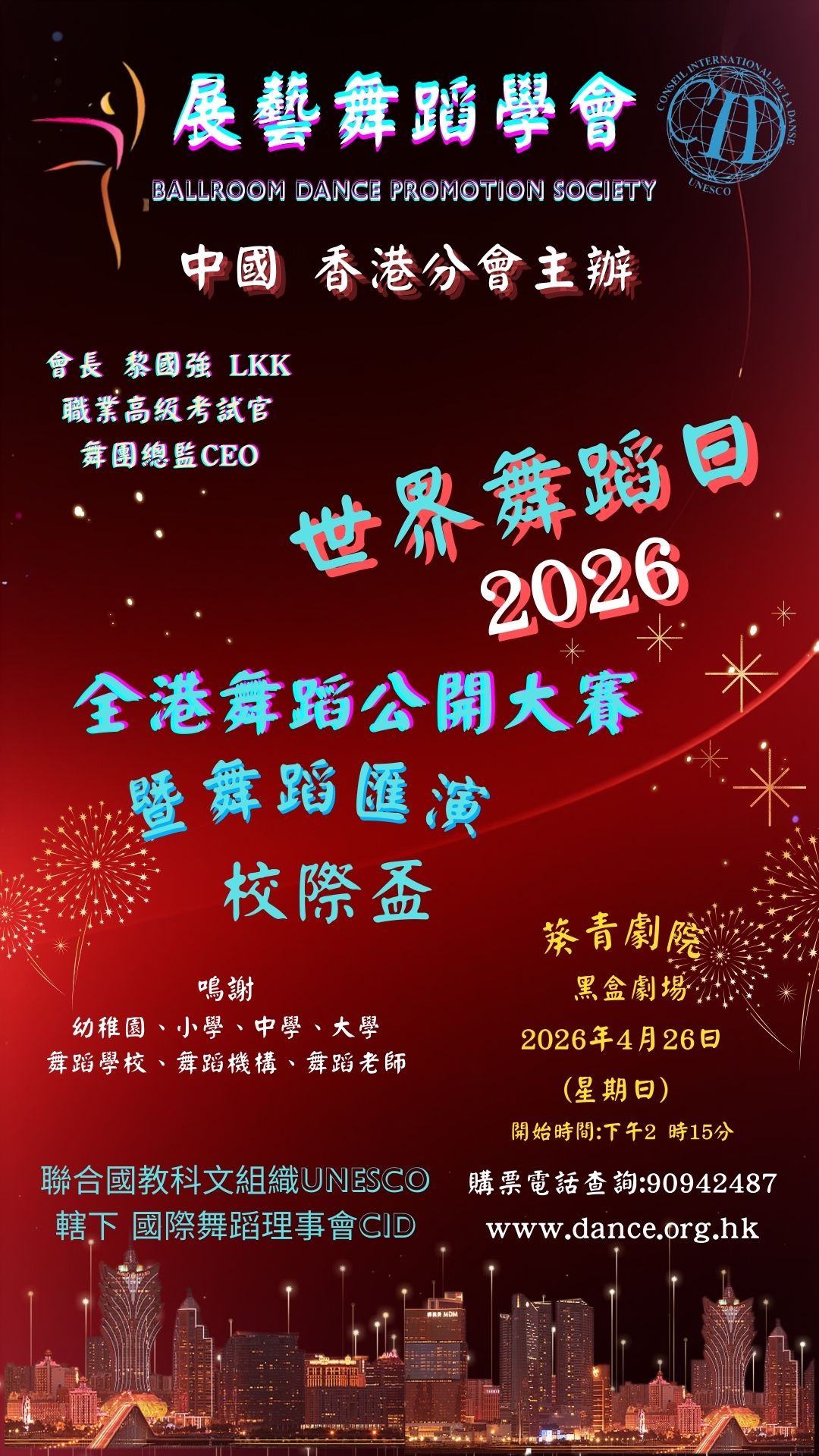 | 世界舞蹈日 CID 盃 2026年4目26月日 中國 香港 校際盃 全港舞蹈公開大賽 䀈 舞蹈匯演 海報 |