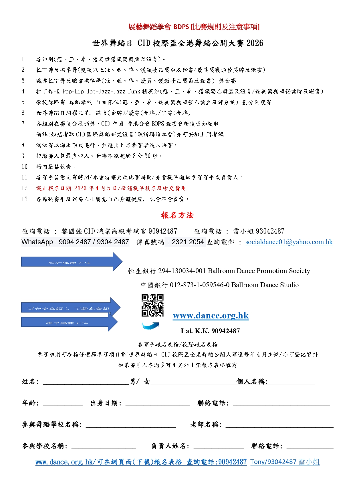 | 2026年4月26日 世界舞蹈日CID校際盃 全港舞蹈公開大賽公開 填寫報名表格 |